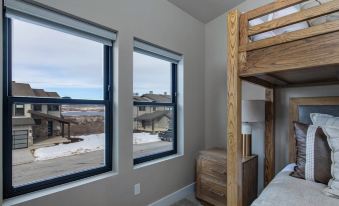 The third bedroom is designed with versatility in mind, featuring a twin-over-queen bunk bed and a 55" Smart TV. This room shares a Jack and Jill bathroom with the fourth bedroom, which is equipped with a queen bed and a 55" Smart TV, both offering stunning views of the Jordanelle Reservoir. For additional guests, a queen-sized, raised, self-inflatable airbed is available, ensuring everyone has a comfortable place to rest.