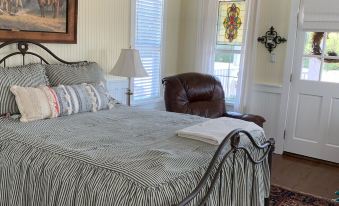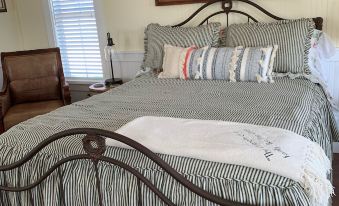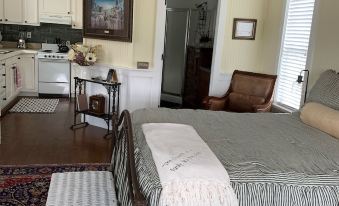 Amenities include a beautiful Queen Size bed dressed with fine linens, Smart TV and available wifi, Full sized kitchen and bathroom, all packaged up in an "old antique cottage" feel.