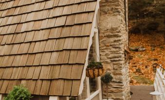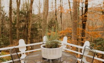 Downstairs bedroom has vintage shutters and a king sized sleep number bed, down alt. cloud comforter and cotton sheets. Full bathroom with charming blue vintage tiles. Towels and bathrobes provided. Modern renovated kitchen including oven, disposal, toaster oven, coffee maker, dishwasher, microwave and a fun new vintage style fridge. Stocked with anything you’d need to host. Cabinet space for pantry items. Stone counter with peninsula seating. Dining space features local photography over the large wooden dining table that seats 8+. Living space centers a black leather couch and floor cushions by the gas fire. Turn on a record, play a game together, curl up and watch a movie. Velvet chair window lounge/plant solarium for bird and weather watching. Upstairs to the right holds the largest bedroom with 2 queens, reading nook with vintage lamp, smart tv, and vanity space. Upstairs to the left is a 3:4 bath with a tiled shower. Continuing to the left is a small charming lofted twin bedroom. 2 twin beds, dvd/tv sit beneath a string lit lofted sitting area. Loft is off limits for guests. Outside on the deck held up by massive boulders, enjoy the beautiful surroundings and the Webster grill connected to the gas line. Outdoor firebowl off limits for guests per Hound Ears, please lounge and cheers in the Adirondack chairs under the forest canopy none the less.