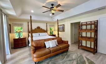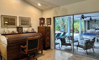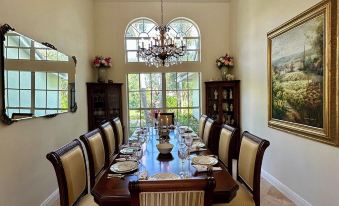 Exquisitely decorated and meticulously clean (really!), this will truly be your home away from home. Lots of space to spread out and relax: the large family room with an oversized leather sofa with 3 power recliners, 2 swivel barrel chairs, a bright dining nook with a view of the gardens, a large kitchen with an island, a spacious living room with gorgeous Restoration Hardware furniture overlooking the pool and pond, and the dining room with seating for 12. The 5 bedrooms are beautifully decorated and so relaxing with very comfortable mattresses ~ 4 with king beds, one with a queen, all with room darkening blinds and/or curtains, 49" Smart TVs and a 65" Smart TV in the primary bedroom. All bedrooms have garden views, 3 have views of the pool and 2 also have views of the pond.