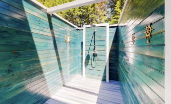 Spacious Backyard With Firepit And Luxurious Outdoor Shower-Modern Serenity