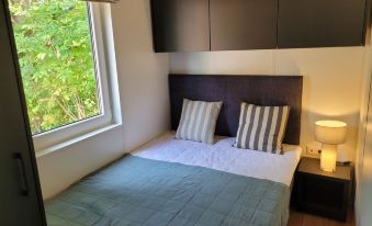 Resort "Campingpark Wemding". 50 houses in the resort. Outside the resort, 2 km from the centre of Wemding, 50 m from the lake. For shared use: slide, outdoor shower, beach volleyball, children's playground, bathing place. In the complex: WiFi, kiosk. 400 m long motor access to the house. Central parking spaces. Supermarket 2 km, restaurant 2 km, bus stop "Johannisgraben-Wemding" 2.2 km, railway station "Nördlingen" 20 km, thermal baths "Treuchtlingen" 21 km. Tennis 1 km, minigolf 50 m, riding stable 1 km, ice rink 500 m. Nearby attractions: Nördlingen / Rieskrater-Museum 19 km, Dinkelsbühl 43 km, Legoland Günzburg 80 km, Playmobil-FunPark bei Nürnberg 100 km, Augsburg 70 km, München 130 km. Well-known lakes can easily be reached: Altmühlsee 35 km, Brombachsee 40 km. Please note: suitable for families. Residence with electric gates. Access to the house only possible between 7 am and 10 pm. Dogs are not allowed on the beach and sunbathing lawn. Kiosk only open from mid may to mid september. "Tiny Haus Soul & Lake", 3-room mobile home 29 m2. Cosy furnishings: living/dining room with dining table and satellite TV (flat screen). Exit to the terrace. 1 room with 1 double bed (140 cm, length 200 cm). 1 room with 2 beds (80 cm, length 200 cm). Kitchenette (oven, dishwasher, 2 induction hot plates, kettle, electric coffee machine). Shower/WC. Terrace. Terrace furniture, electric barbecue (portable). Facilities: Internet (WiFi, free). Please note: non-smokers only. Smoke alarm, fire extinguisher. The house is right next to DE8834.200.5. Note: The WiFi connection may be limited depending on capacity.