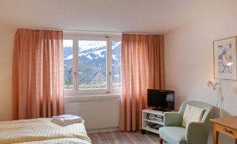 Chalet "Helene". On the outskirts, 600 m from the centre of Wengen, in a quiet, sunny position on a slope, 150 m from the edge of the forest. In the house: central heating system, washing machine, tumble dryer (for shared use). Pre-arrival grocery service. Shop, supermarket 750 m, restaurant, bar 450 m, bakery 700 m, 12 minute walk to the centre, bus stop "Lauterbrunnen (by train)" 3.8 km, railway station "Wengen" 750 m, outdoor swimming pool 1 km. Cable car, skisport facilities 600 m. Well-known lakes can easily be reached: Thunersee 13 km, Brienzersee 13 km. Please note: car-free holiday complex. Arrival via mountain railway. Additional accommodations can be booked. Arrival is only possible by train from Lauterbrunnen – 14 minutes driving time. "Helene Apt. Hella", 2-room apartment 42 m2, on the lower ground floor. Practical and comfortable furnishings: living/sleeping room with sliding door with 1 double bed (2 x 90 cm, length 200 cm), satellite TV and radio. 1 small room with 1 bed (80 cm, length 200 cm). Small kitchen (3 hot plates, oven, toaster, kettle, electric coffee machine, Capsules for coffee machine (Nespresso) extra, fondue Set (cheese)). Bath/shower/WC. View of the mountains. Facilities: Internet (WiFi, free). Please note: non-smokers only. Maximum 1 pet/ dog allowed.