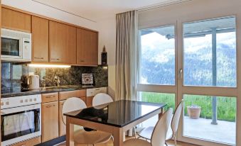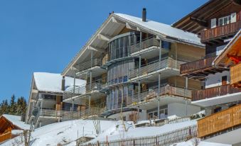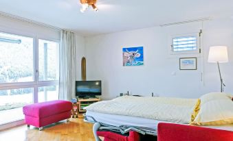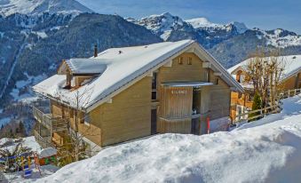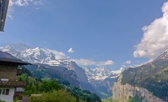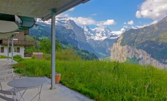 Chalet "Silence". Below Zentrum Wengen, 800 m from the centre, in a quiet, sunny position on a slope. In the house: central heating system. Pre-arrival grocery service. 100 m long steep motor access to the house. Grocery 800 m, restaurant 500 m, bakery 800 m, 10 minute walk to the centre, bus stop "Lauterbrunnen (by train)" 3.8 km, railway station "Wengen" 800 m. Cable car, skisport facilities 800 m, children's playground 500 m. Well-known lakes can easily be reached: Thunersee 13 km, Brienzersee 13 km. Please note: car-free holiday complex. Arrival via mountain railway. Arrival is only possible by train from Lauterbrunnen - 14min. path. "Silence Apt. H", 1-room studio on the ground floor. Bright, comfortable and cosy furnishings: large living/sleeping room with 1 double sofabed (160 cm, length 200 cm), cable TV and radio. Exit to the patio. Open kitchen (oven, dishwasher, 4 ceramic glass hob hotplates, toaster, kettle, microwave, electric coffee machine, Capsules for coffee machine (Nespresso) extra). Bath/WC. Large patio. Terrace furniture. Marvellous panoramic view of the mountains and the valley. Facilities: hair dryer. Internet (WiFi, free). Please note: non-smokers only.