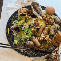 Завтрак был упакован в другом ресторане, обслуживающий персонал разговаривал громко, и вы бы не догадались, что это ресторан для завтраков, пока не спросите. После этого один из них громко сказал: Куда вы кладете талоны на питание? (Грязная пластиковая корзина). Другой крикнул: «Принеси его сюда». По одному на человека. Как будто есть могут только те, кто ходит к ней домой. На вещах не было этикеток, и они не были горячими. На столе стояла тарелка с салатом, и любой, кто знал, мог сказать, что это салат. Но заправки для салата нет. После этого вопроса женщина, лениво евшая лапшу, встала и достала ее из-под стола.