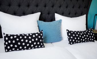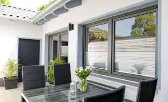 All 3 cottages are designed for 4 people each. They are at ground level and have a modern bathroom with shower, as well as 2 separate bedrooms, each with a large double bed. The light-flooded open kitchen is fully equipped and allows you to cook at home. The loft-like living and dining area invites you to cozy cooking evenings. Those who prefer to enjoy the evening sun with a relaxed barbecue will get their money's worth on the adjacent terrace with an electric grill. A large flat screen with smart TV, a radio and free WiFi are available for your entertainment.