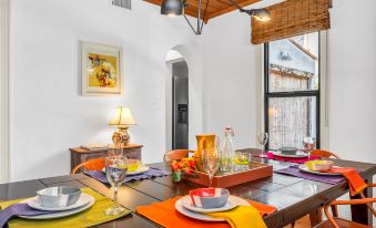 The Dining Room is a funky space with bright orange chairs, low-hanging industrial-style lights, and colorful artwork. The room is conveniently situated next to the Kitchen for easy access.
