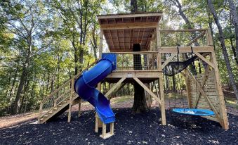 Custom treehouse with a slide, climbing wall, swing, and climbing net
