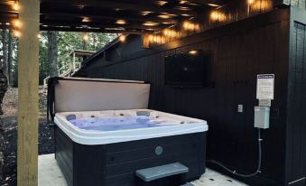 For those who enjoy games and sports, the outdoor game room is a true highlight. Featuring an 85” TV, it’s ideal for watching fall football games with the whole family. The space is also equipped with a comfy couch, a ping pong table, and a range of arcade games to keep everyone entertained, including the little ones. Next to the game room is a covered luxurious hot tub with forest views, perfect for soaking while enjoying a favorite movie or sports on the mounted TV.