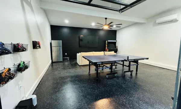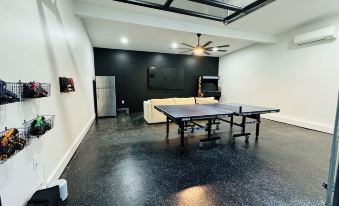 Outdoor game room featuring an 85” TV, ping pong table, and arcade games