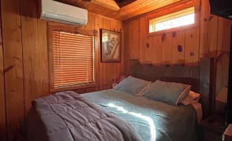 Rooster's Inn is a beautifully crafted 600 sq ft cabin that combines rustic charm with modern amenities. It sleeps up to five guests, with a queen bed in the bedroom, two twin day beds in the dining area, and a pull-out sofa in the living room. We provide a variety of amenities, such as high-speed internet, a Keurig coffee maker, games, puzzles, fishing poles, and pool sticks.