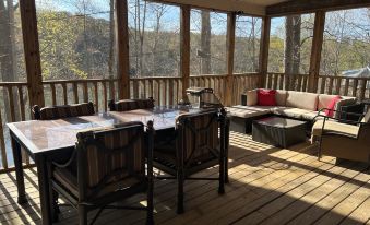 Nestled in the woods near Helen, GA, in Mountain Lakes Resort, on a 50 acre lake sets Boo Boo's Cabin. This is a unique loft bedroom, 1 bath cabin that sleeps up to 4 guests. This cabin has a queen bed in the loft with its own balcony to enjoy the morning Chattahootchie National Forest views and a pull out queen bed in the livingroom where you can step out the french doors to a huge screened in porch and watch the sunrise over Lake Qualatchee. This cabin is fully stocked giving you the conveniences of home while away. It comes with a Washer Dryer, a kitchen equipped with electric range, Fridge/ Freezer, microwave, and all the utensils you need for meal prepping after a day of shopping, hiking, or swimming. The full bath has a vanity and a shower tub combo perfect to soak those tired muscles after a long day.