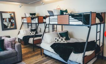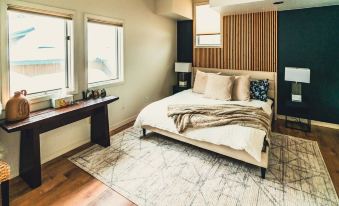 Master Bedroom located on the top floor, has a modern upholstered king bed featuring a unique Scandinavian inspired wood paneling, sitting area and full bath. On the lower level of this townhouse are 2 additional bedrooms and a cozy den area with flatscreen. Both downstairs bedrooms offer full queen size beds with simple modern linens and large faux fur throws. Also a feature on these downstairs beds, are the heated mattress pads, with dual controls and automatic timer for those chilly Montana nights. The den is located outside the bedrooms and is a cozy area with a full-size daybed, also with heated mattress pad! This lower level also has a full bath, a full washer and dryer and closets for each room!