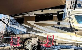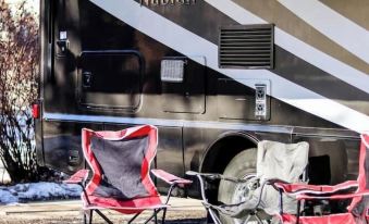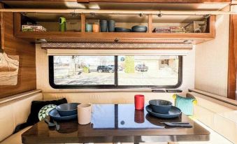 Navi is parked in the biggest backyard in the city! It's like a park with flowers and shrubs galore, enough firewood to have a continuous campfire all weekend, raised gardens, shade trees, and a MEGA playground that is 3x the size of a normal playset. Even adults can play on it. The square aluminum picnic table seats 8 comfortably. Please come enjoy this unique in town camping experience.