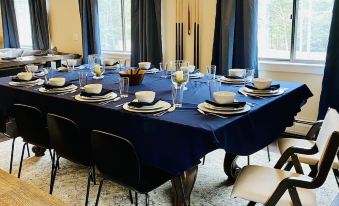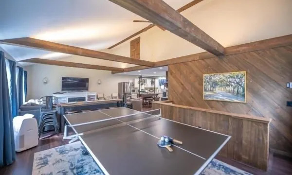 Large comfortable sectional in living area with giant smart tv. New RealFlame fireplace. Beautiful 8’ pool table converts into a ping pong and dining table. You can easily fit 12 people around the table for family meals. All table linens provided. Dart Board, puzzles, board games and more make this the space everyone will congregate to make lasting memories. The coffee bar is stocked with complementary coffee and tea to start your day off right. High-speed fiber optic cable internet for those looking to work remotely is fast, reliable, and free for our guests.