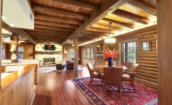 Upon entering, you’ll be greeted by the warm and inviting ambiance of the lodge’s charming log cabin decor. The spacious living areas are designed for gathering, while the full kitchen—equipped with all the essentials, including a refrigerator, oven, electric range, microwave, dishwasher, and coffee pot—makes meal preparation a breeze. Share meals at the dining table with seating for eight, all while enjoying breathtaking views of Cypress Creek.