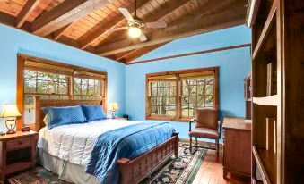 Each bedroom is thoughtfully appointed to ensure a restful night’s sleep. The master suite boasts a king-sized bed and its own wood-burning fireplace, offering a cozy retreat for chilly evenings. The en-suite bathroom features a luxurious walk-in shower. The second bedroom includes a plush queen bed, while the third bedroom also offers a comfortable queen bed. A spacious second bathroom with a dressing area and walk-in shower serves the other guests.