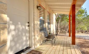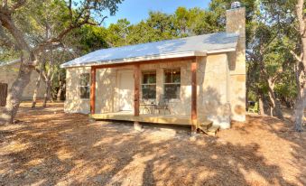 The cozy living area beckons you with the allure of a wood-burning fireplace and a seamless blend of rustic charm. The kitchen and dining space offer ample room to prepare and savor delectable meals. A dining table for four creates an inviting space for sharing meals. Choose from the two bedrooms: Bedroom one is a true haven of comfort, relaxation and charm with its king-size bed adorned in lovely linens and rustic furnishings. Bedroom two hosts 2 twin beds with cottage inspired decor. For your convenience a washer and dryer is located just off the kitchen area. Throughout the cabin, stunning hardwood floors lend an air of warmth and elegance.The bathroom boasts a shower-tub combo, providing ample space to freshen up for the night's adventures. As daylight fades, indulge in the outdoor patio area, perhaps with a glass of your favorite wine in hand. The patio also features a charcoal grill, perfect for crafting delicious burgers, hotdogs, and finger foods. Absorb the serenity of the surrounding views from the deck, and when the stars emerge, gather around the chiminea, letting its warm glow create a magical atmosphere for evenings under the Texas sky. The Mountain Laurel Cabin awaits your arrival offering comfort and charm. Come and discover a haven where cherished memories are born and Hill Country dreams come true.