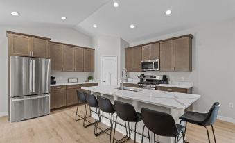 The main floor of this home features luxury vinyl plank flooring throughout, a full-size hall closet, a large kitchen island with seating for up to 6, stunning floor-to-ceiling stone gas fireplace and a mounted 60” Roku Smart TV above the fireplace, white quartz countertops accented with gray and gold in the kitchen and bathrooms, full-size stainless steel appliances including a gas range, refrigerator/freezer with water filter and ice maker, microwave, dishwasher, large sink, toaster, Keurig coffee maker (with coffee pods), walk-in pantry, and ample kitchen cabinets.