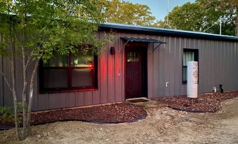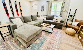 This family-owned property features a striking metal exterior with a sleek gray barn-style design, complemented by modern black trim. As you step inside, you’ll be greeted by a vast living and dining area perfect for gathering with friends. Relax on the generous sectional sofa, complete with cozy throw blankets and pillows, ideal for movie nights after a day on the water.
