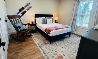 The main house has two beautifully appointed king bedrooms, each with a closet and smart TV, as well as a shared bathroom with a tub/shower combo. One full room is deemed the 'kids room' and offers a cozy full, smart TV, large dresser, rocking chair. Off the back porch using a separate entrance is a Queen room with it's own private bathroom with a shower.