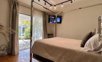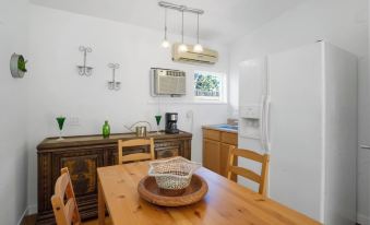 A detached guest house with a KING SIZED bed, with a bathroom and shower, a dining table that seats 4 guests, along with a kitchenette, and a double door refrigerator.