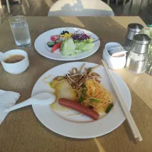 Завтрак нормальный, но с некоторыми общими категориями. Горячим блюдом является рисовая лапша, которой не хватает сианьских особенностей. Однако вокруг много ресторанов.