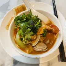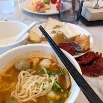 Ресторан недавно открылся, довольно чистый, а вокруг довольно оживлённо. Завтрак не очень разнообразный, но его достаточно. Лапша сатай хороша.