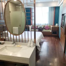 У отеля есть своя парковка, что более удобно. К тому же, станция метро находится относительно близко, поэтому путешествовать очень удобно. Семейный номер, который мы забронировали, был люкс. Цвет номера был темнее и выглядел немного старым. Видимые части комнаты были чистыми, но место под кроватью, вероятно, никогда не убиралось. Там было полно пыли и мелкого мусора. Побывав некоторое время в провинции Фуцзянь, я почувствовал, что ванные комнаты отелей здесь имеют кислый запах, особенно после использования горячей воды. Не знаю, связано ли это как-то с климатом. Но я думаю, что, возможно, в отеле не установлены сливы в полу и водопроводные трубы с защитой от запаха, поэтому запахи легко проникают. На следующий день я рассказал о ситуации уборщице. Она сказала, что поможет нам тщательно очистить ванную комнату с помощью горячей воды и дезинфицирующего средства. Я почувствовал себя лучше после того, как вернулся той ночью, но запах был более заметен, когда я использовал воду. Я чувствую необходимость установить средства против запаха. Также было бы неплохо иметь в ванной больше крючков для подвешивания одежды.