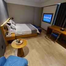 Was told I am given a free room upgrade, but honestly I can't tell the difference. Also the room in the listing image was larger and brighter but the actual room I received was extremely rather grim looking, not to mention it doesn't even look like half the room size in the listing image. I also can't seem to adjust the aircon temp as it will remain at room temperature no matter what I set, however xining is quite cooling in general so it's still acceptable. In the room I was give, the glass panel at the washroom side had a severely cracked side which seem like it will break if I had closed the glass door too hard. I took a video immediately before using the toilet in case it really does get shattered, but luckily it did not Very unsafe nevertheless. The shower was the worst, every night I had to gamble if it will be cold or scalding hot water. I set the shower value slightly towards the warm side, and the water became scalding hot within seocnds, and if I move it to the cold side, it became freezing cold within seconds. Even if I set it exactly in the middle, it will give me either one of the extreme temperature. Had to keep adjusting from hot to cold so that it stay at a comfortable and safe temp range. The toilet bowl flush in a very stupid manner too, by first flooding the bowl from bottom up, this means that if you took a dump and it's a slightly sticky one, it's gonna stick. The electric kettle was so noisy when turned on that it sound like a train passing right beside my room. And speaking of noise, the sound proofing of the room was one of the worst of every single hotel I stayed in before. You can literally hear new occupants dragging their luggage or family chattering non stop right after they exit the lift. FYI, my room was literally the furthest away. Every time your neighbors from 3 room away turn on their tap water, you can hear it, even if that's like 4am in the night. The hairdryer is a safety hazard too. Tried to use it once and after plugging in and turning it on, smoke immediately came oozing out of it, so I immediately switched it off and remove the plug. Never used it since. Oh yes one last thing I have to say is that as a hotel PLEASE NEVER USE MOVEMENT OR VOICE CONTROLLED LIGHTINGS. While I wash up every day, I had to keep waving my hands like an ***** every few minutes in order to prevent the lights from going out. The detection is sooooo off that unless there's a huge action at the correct spot, it will not turn the lights back. This was absolutely annoyance.