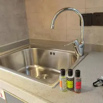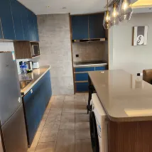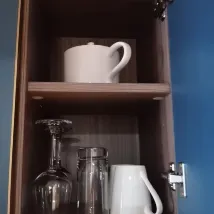 В номере большая удобная кровать, небольшая кухня с индуктивной плитой и микроволновкой, холодильник. Санузел чистый и новый.