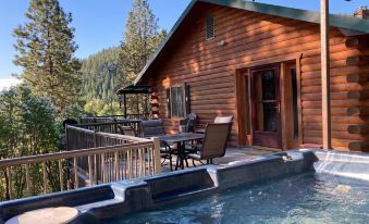 This hillside lodge features a spacious living area with stunning views of the Naches River gorge and surrounding hills. The unique log construction exudes charm, while a glass-roofed hot tub offers serene vistas of the gorge walls and hummingbird feeders. In the Winter, enjoy the warmth of gas fireplace stoves framed by local stonework in both the living and family rooms. The rustic charm is complemented by modern comforts, ensuring a cozy yet luxurious stay.