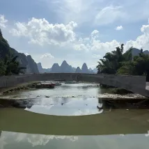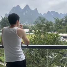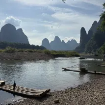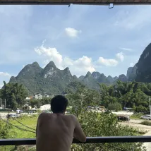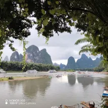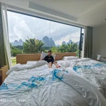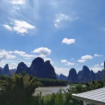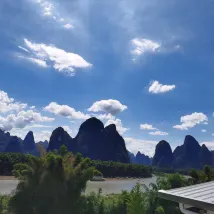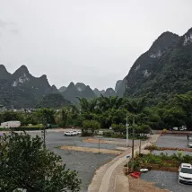 Сразу к делу. Воздух чудесный. Совсем рядом находятся билетная касса и место сплава по реке Ли на бамбуковых плотах. Внизу, в древнем городе Синпин, можно арендовать электромобиль, чтобы исследовать живописные окрестности. Очень доволен.