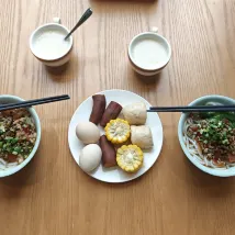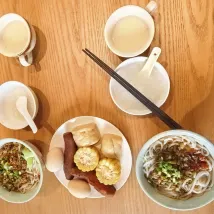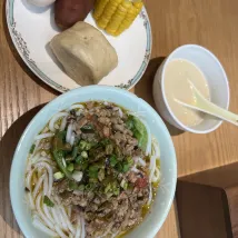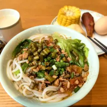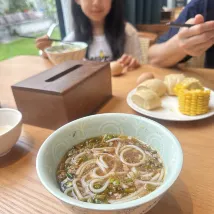 Завтрак очень внимательный и подается в соответствии с количеством мест. Рисовая лапша восхитительна, кислые бобы в ней хрустящие и ароматные, а паровые булочки, похоже, домашние. Соевое молоко свежеприготовленное утром и очень ароматное. Вся семья очень довольна.
