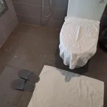 4. Пол в ванной был под неправильным углом. После душа вода скапливалась в унитазе и не стекала в слив. Тапочки, которые нам предоставили, были очень скользкими, даже при небольшом количестве воды. Я дала им только две пары нескользящих тапочек для ванной, так как нас было трое. Нам приходилось менять обувь каждый раз, когда мы ходили в ванную, чтобы не поскользнуться. 5. Не хватало розеток, а розетка в стене работала некорректно. Зарядное устройство легко отваливалось. Чтобы зарядить устройство, приходилось стоять в очереди троим, и была вероятность, что оно вообще не зарядится.