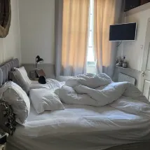 Second, the room is tiny—there’s no desk for skincare or makeup, and nowhere to sit except the bed. The bedding is low-quality, and the mattress has a weird bulge in the middle.