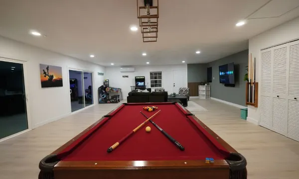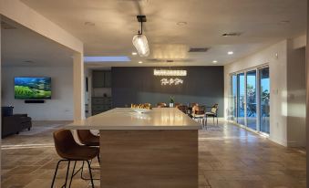 The game room has plenty of entertainment such as a pool table, arcade games, board games, and a 75” TV with a sectional sofa. Challenge friends to a game of billiards or cozy up with a board game while enjoying panoramic views of the breathtaking Joshua Tree landscape.