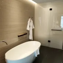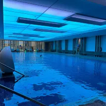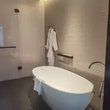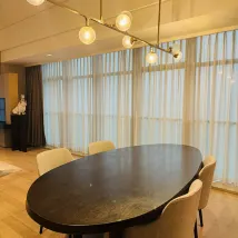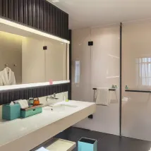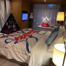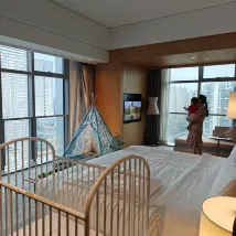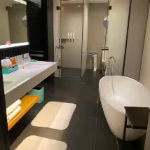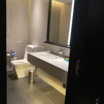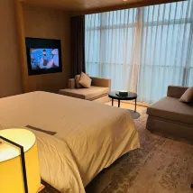 Обслуживание удовлетворительное, чистое и гигиеничное. Комната очень большая, все с электрическими шторами, большими стеклянными окнами от пола до потолка, двумя туалетами, двумя раковинами и множеством ультраменов. Моему сыну он очень нравится.