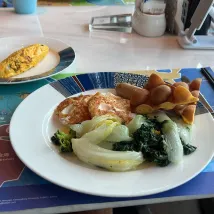 Завтрак был интернациональным, но я бы посоветовал заказать традиционный бекон и картофельные оладьи.