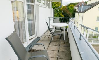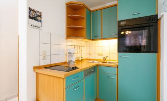Apartment block "Dünenresidenz", 2 storeys. In the resort Zinnowitz, 200 m from the sea, 200 m from the beach. In the house: storage room for bicycles, central heating system. Communal covered parking. Parking space or garage only for small to medium-sized cars. Dimension: height 190 cm. Supermarket 350 m, restaurant 20 m, bakery 100 m, café 100 m, bus stop 100 m, railway station 1.5 km, sandy beach 200 m, thermal baths "Bernsteintherme" 650 m. Marina 2.5 km, golf course (18 hole) 25 km, surf school 650 m, tennis 1 km, minigolf. "Dünenresidenz 23", 2-room apartment 46 m2 on 2nd floor. Beautiful and cosy furnishings: living/dining room with 1 sofabed and cable TV (flat screen), radio. Exit to the balcony. 1 room with 1 double bed. Kitchenette (oven, dishwasher, toaster, kettle, electric coffee machine). Shower/WC. Balcony. Balcony furniture. Facilities: children's high chair, baby cot. Please note: non-smokers only. Smoke alarm.
