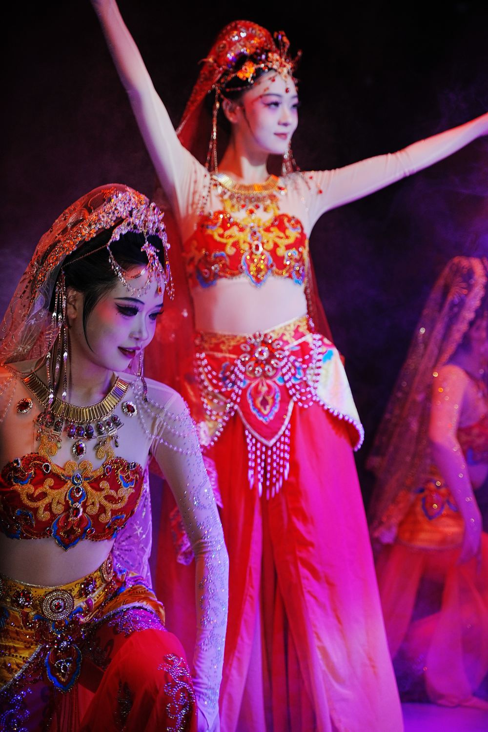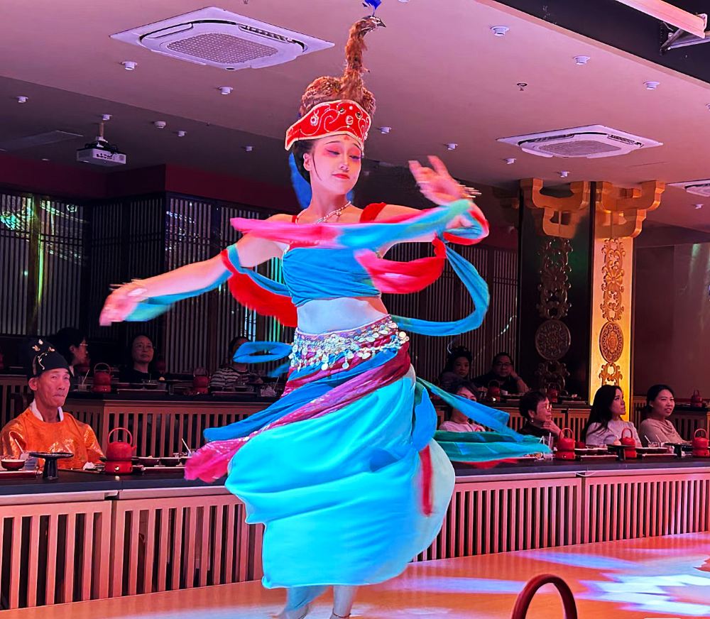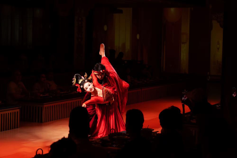 Танцовщицы в расшитых золотом платьях исполняют «Танец испуганного лебедя», их движения синхронизированы с ритмичными ударами барабанов. Юбки развеваются, словно крылья бабочек, перекликаясь с дворцовыми фонарями и расписными ширмами — кажется, будто древний двор ожил.