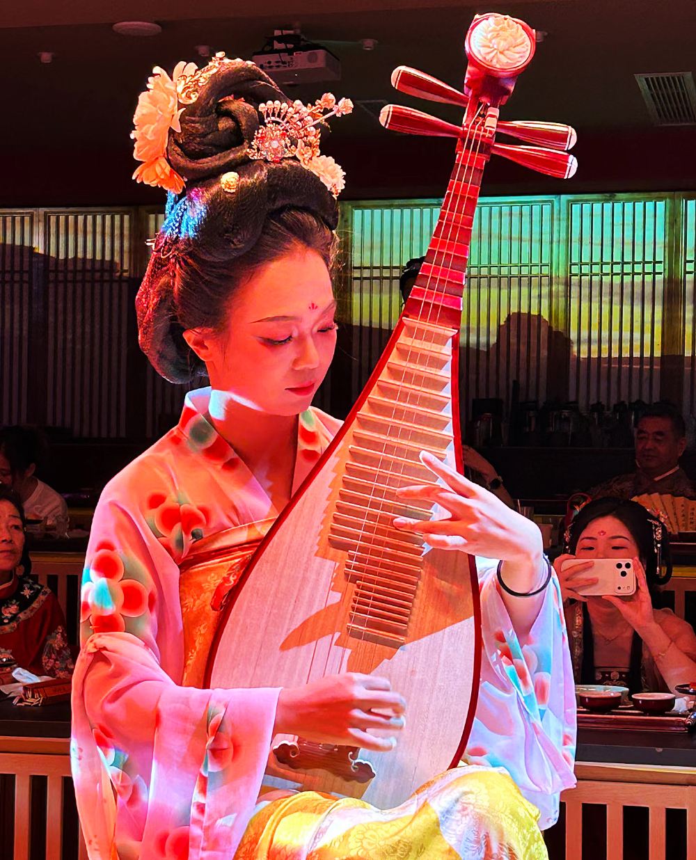 Музыкант, одетый в ханьфу, нежно перебирает струны, наполняя зал вечными мелодиями «Высоких гор и текущих вод» и «Вечерней песни рыбацкой лодки». Изящные ноты мгновенно окутывают пространство классическим очарованием.