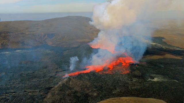Пролет над местом извержения вулкана Рейкьянес в 2021-2025 годах.