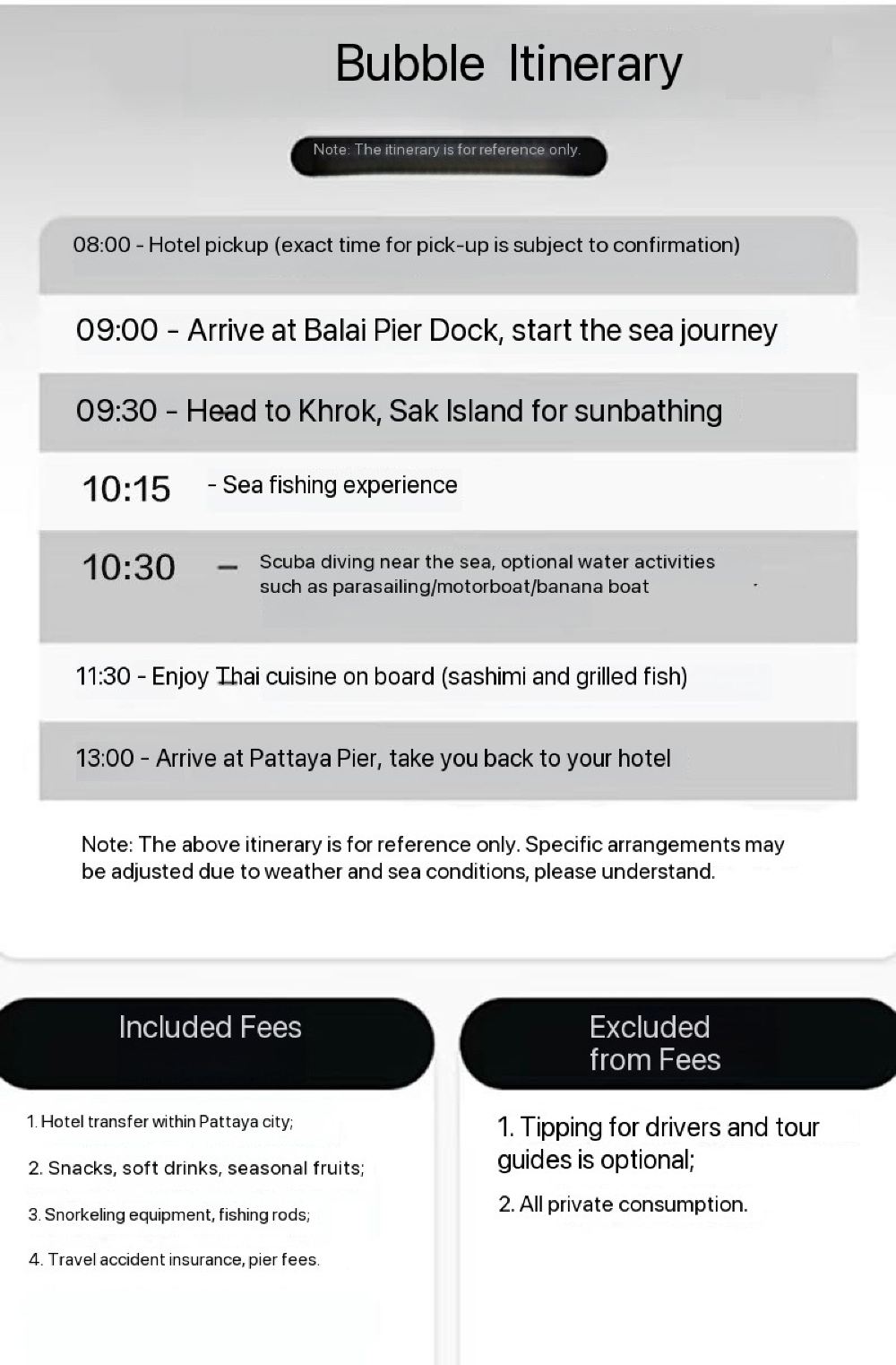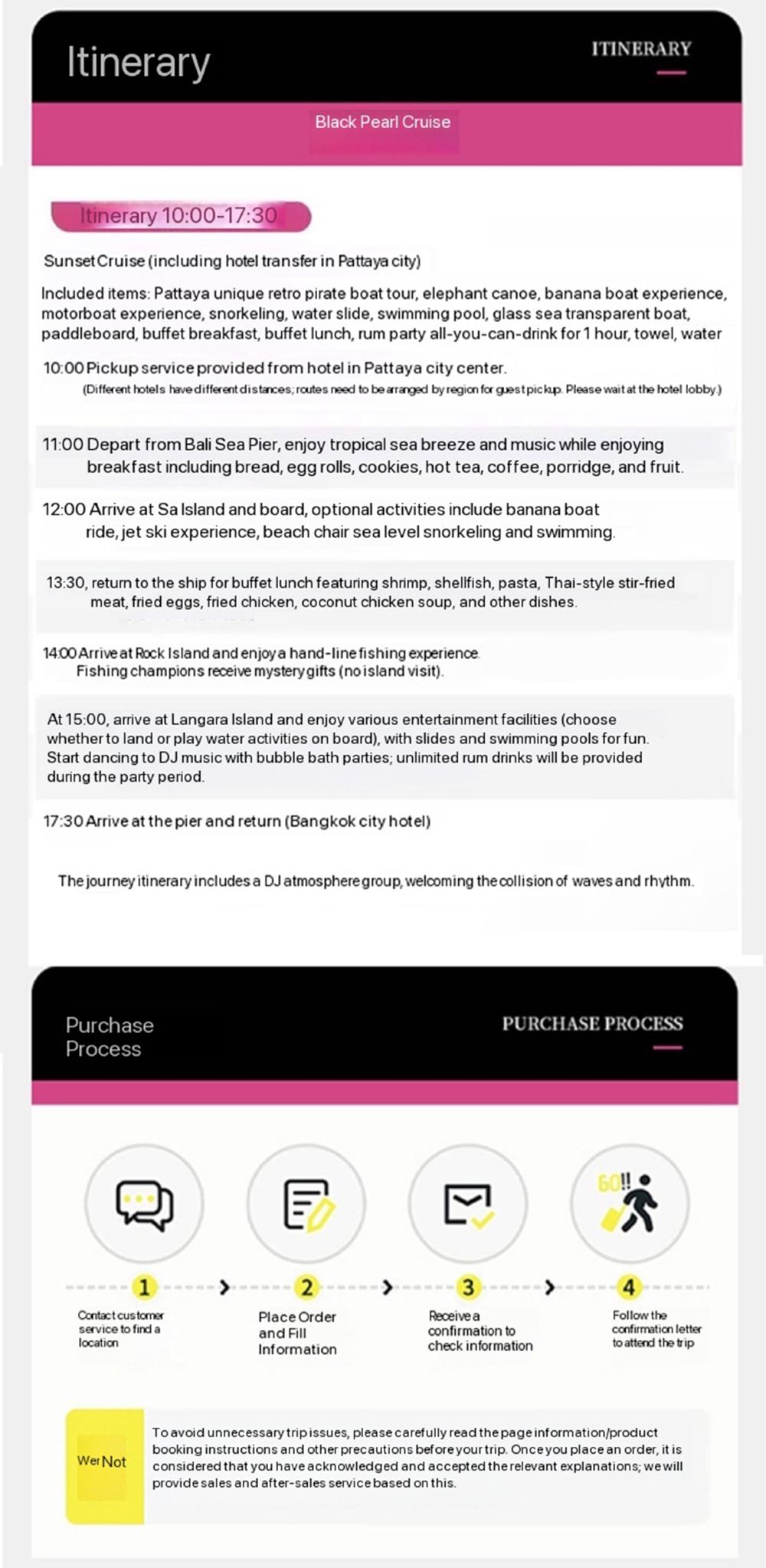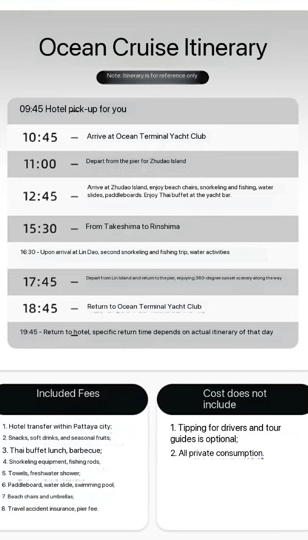 2. Гостям, добирающимся до пирса самостоятельно, необходимо прибыть на пирс к указанному службой поддержки времени. Пожалуйста, учитывайте загруженность дорог и рекомендуем вам отправляться заранее. Если вы опоздаете к отправлению катера, плата не возвращается, а убытки несет гость. Во избежание ненужных потерь, пожалуйста, отправляйтесь заранее. Благодарим за понимание.