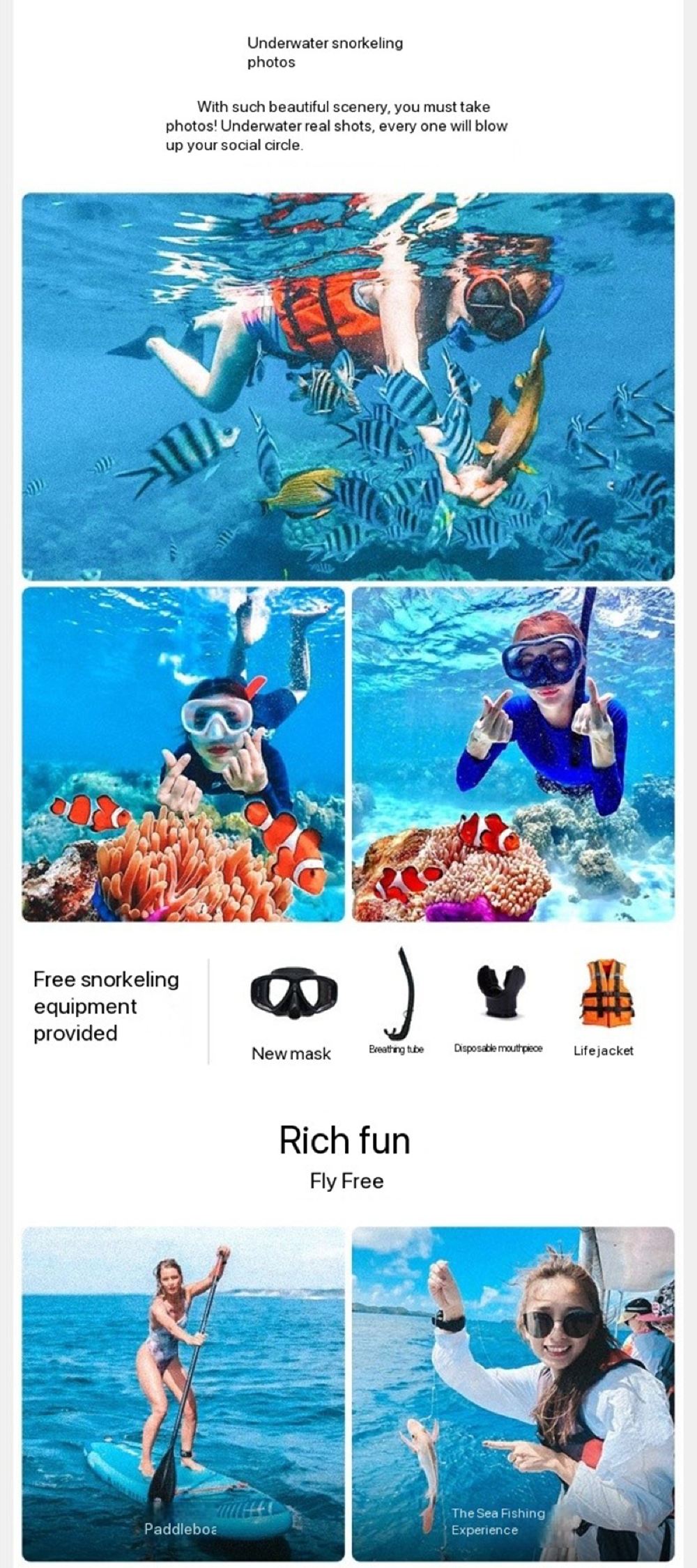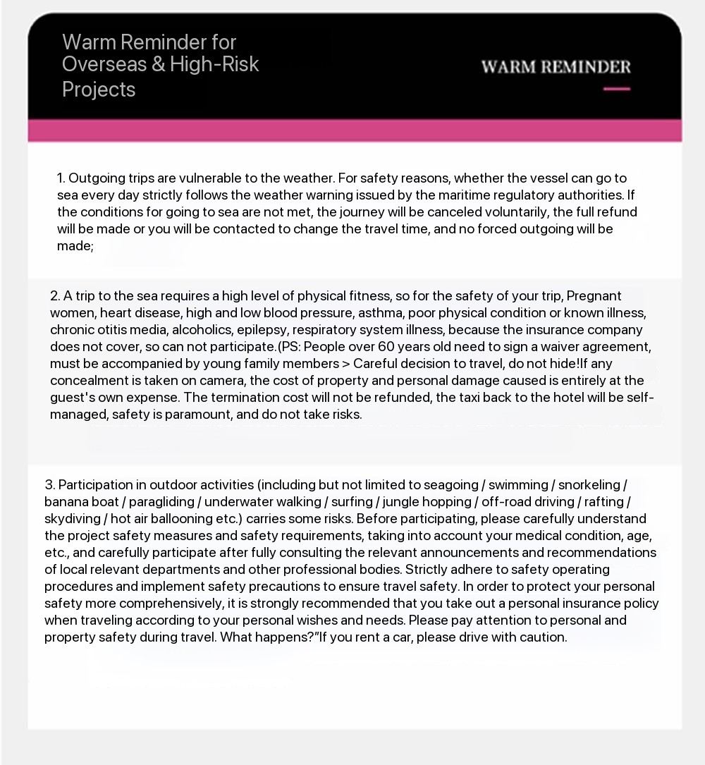 ❸ Обязательно надевайте спасательный жилет, выходя в море. Спасательные жилеты выдаются лодочником. Не приближайтесь к рифам, морским ежам и кораллам — они очень острые. Не заходите в глубокие водоёмы.