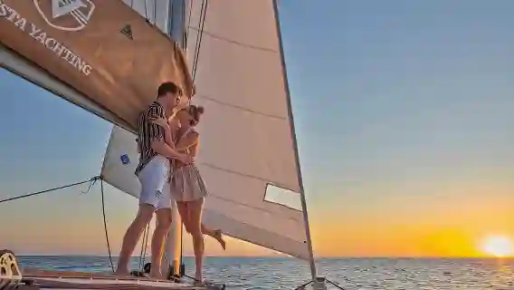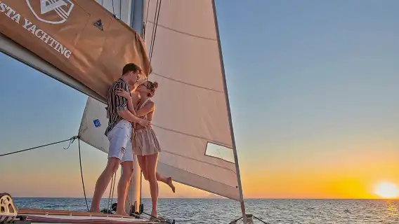 Роскошный круиз на парусном катамаране на закате Санторини с барбекю, напитками и трансфером