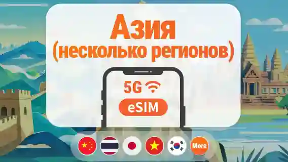 Азия, 9 направлений, 5G eSIM | Япония, Таиланд, Вьетнам, Индонезия, Корея и другие | 1–30 дней | Мгновенный QR