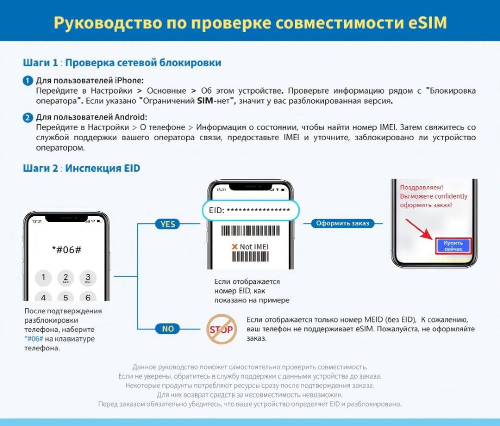 Проверка: наберите код `*#06#` в режиме набора номера. При наличии кода EID устройство поддерживает eSIM.