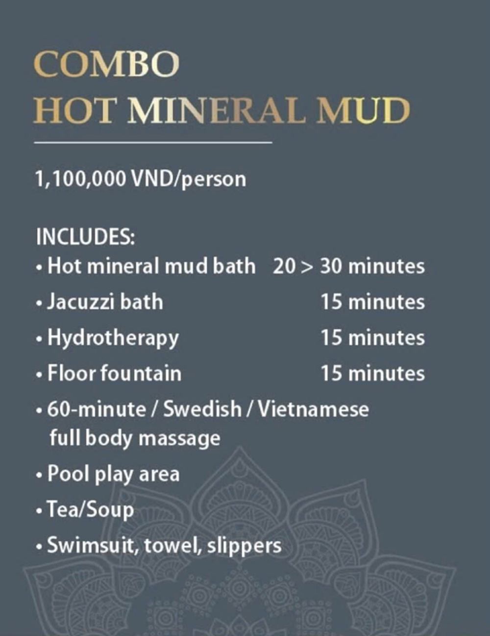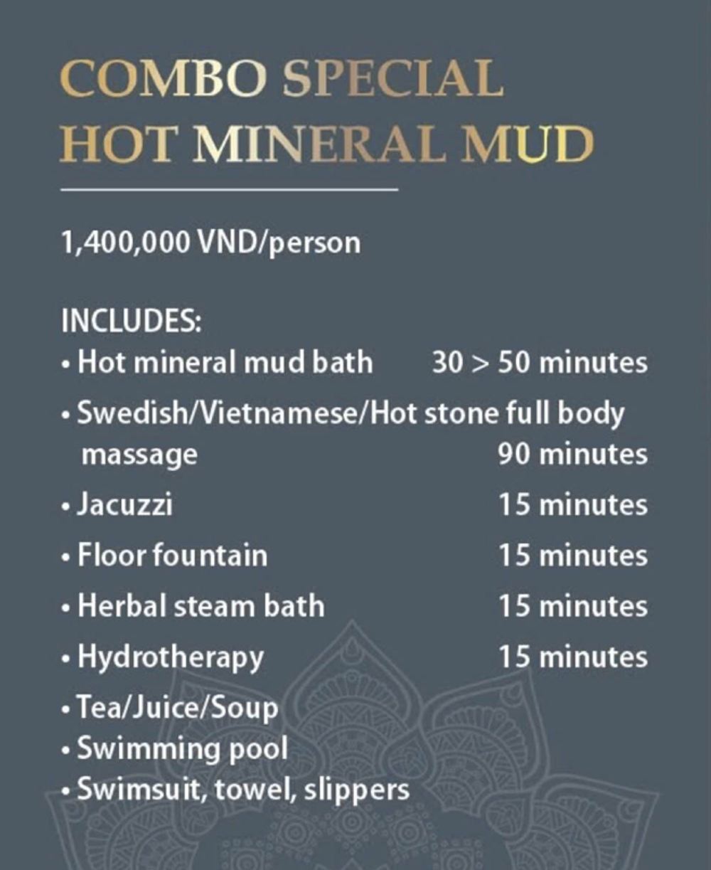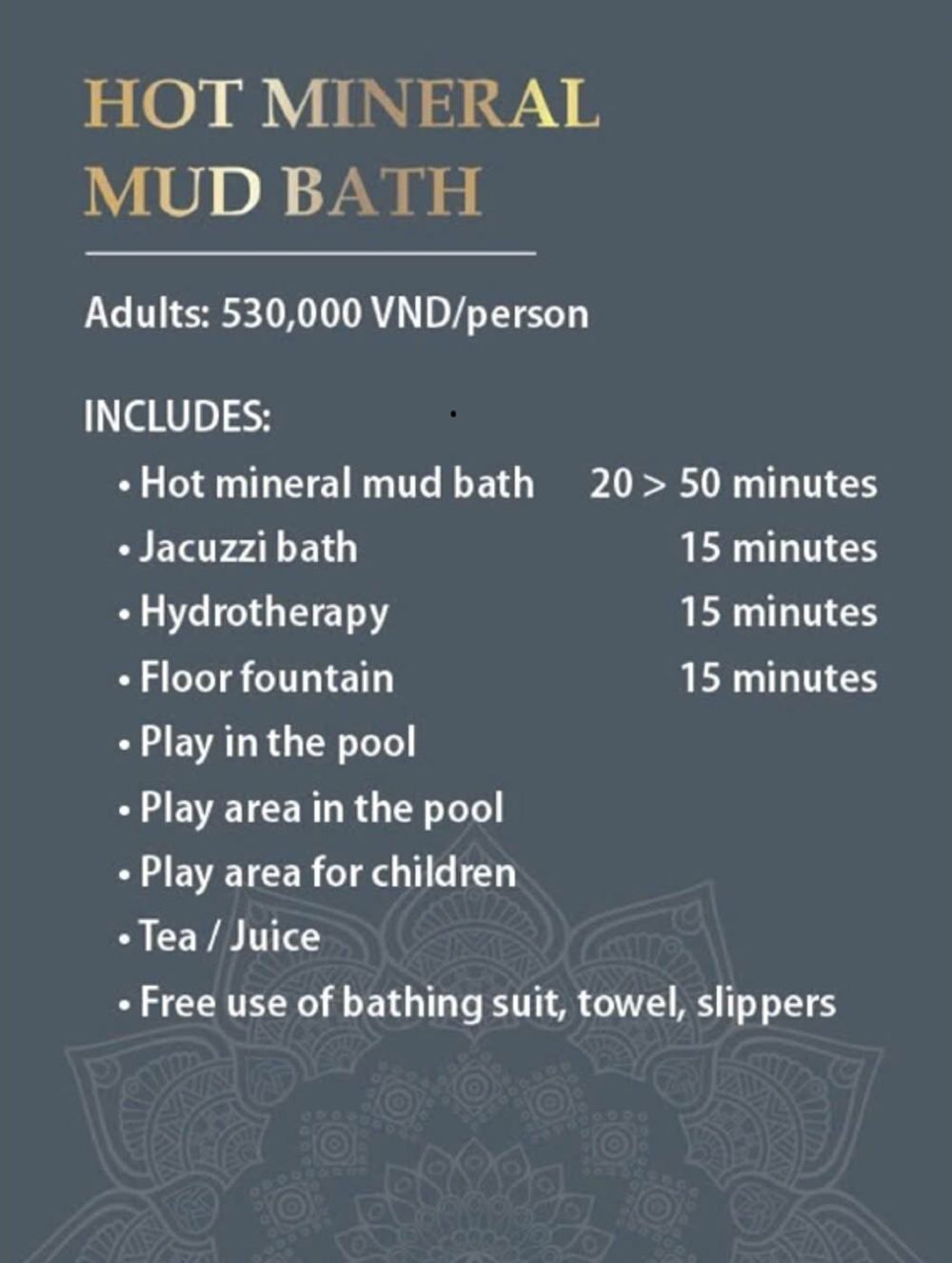 Грязевые ванны Soc Nau на Фукуоке расположены в центре города и являются идеальным местом для отдыха посетителей. Здесь предлагаются услуги грязевых ванн, минеральных источников, расслабляющего массажа и развлечений. Как природная терапия, это прекрасное загородное пространство поможет очистить разум, принести ощущение свежести и расслабления, а также новые размышления о жизни благодаря уникальному пакету услуг грязевых ванн с насыщенным спа-стилем.