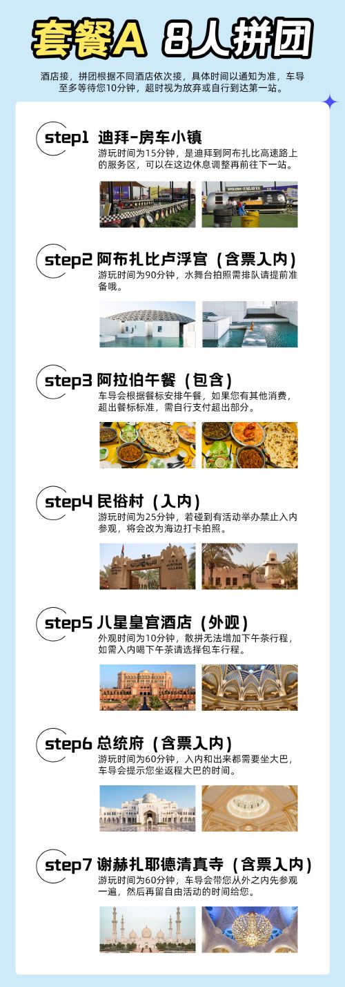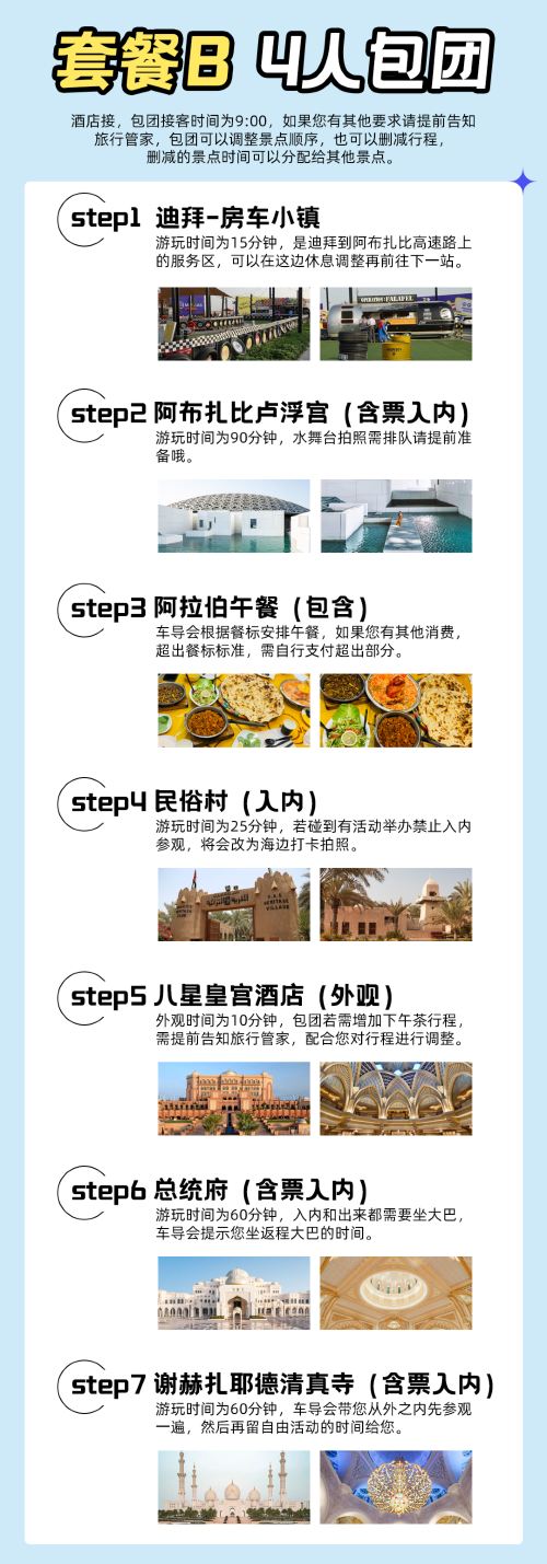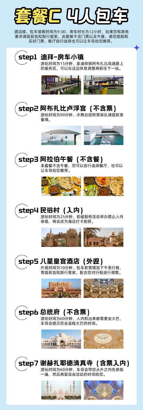 Комплексный обед A и комплексный обед B включают входные билеты в Лувр, Президентский дворец, мечеть, а также обед; комплексный обед C — это индивидуальный трансфер, цена одинакова для 1-4 человек, оплата за автомобиль, входные билеты и обед не включены.